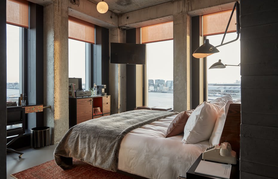 Sir Adam Hotel offers stunning views over the IJ river, uniquely designed rooms with a modern, creative vibe, and is located just a short walk from the event venue. Enjoy easy access to Amsterdam Central Station via the ferry, great in-house dining options, and a truly inspiring atmosphere.